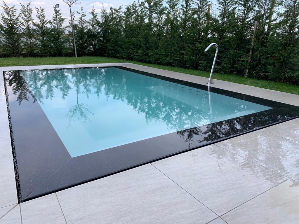 This pool features a staircase with three ample steps positioned at the front, extending across its width. The linear pathways create an elegant entry, achieving a refined and classic look.